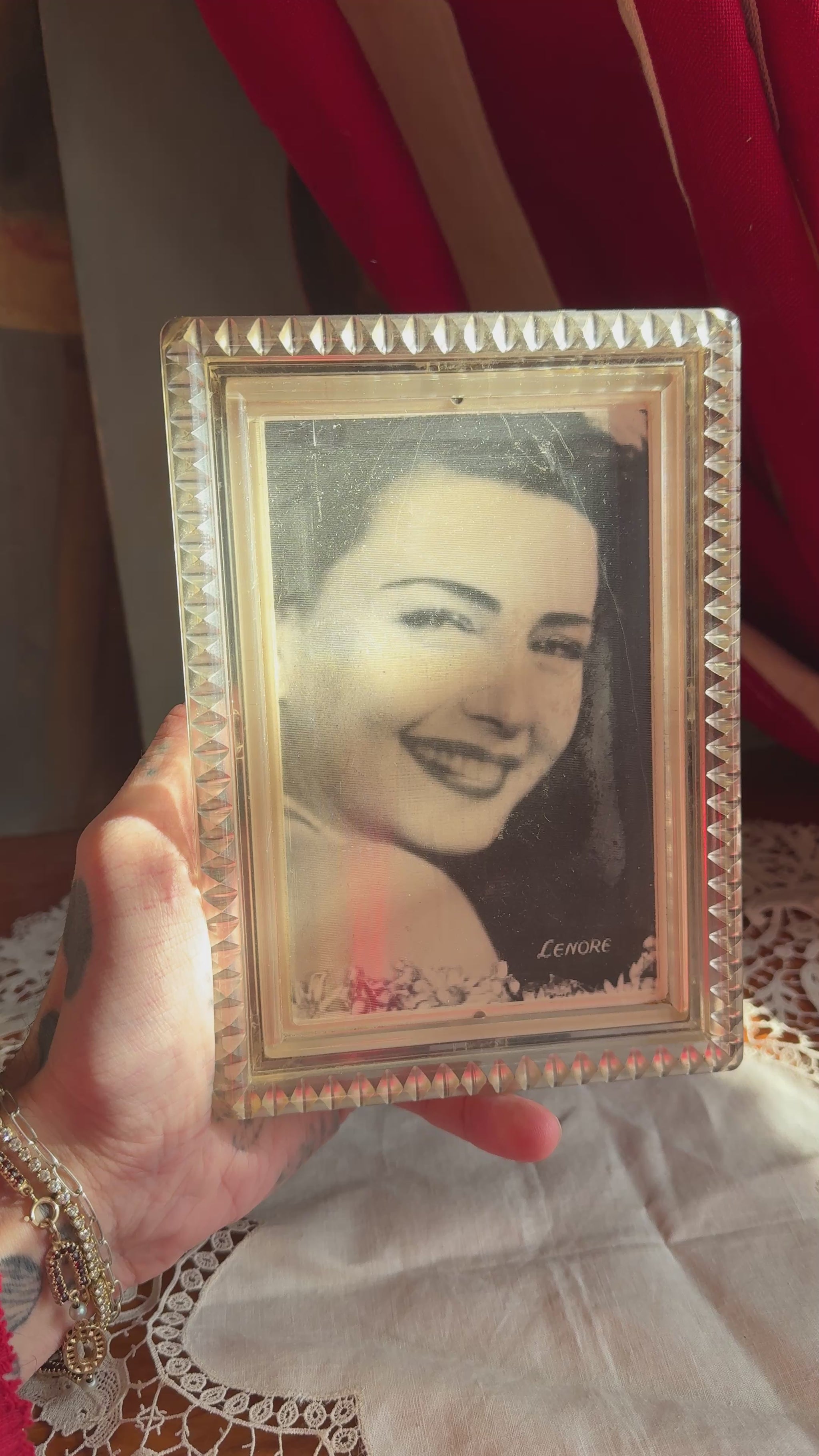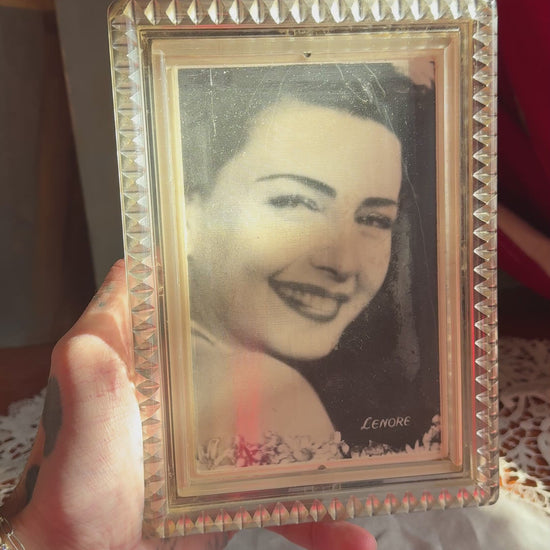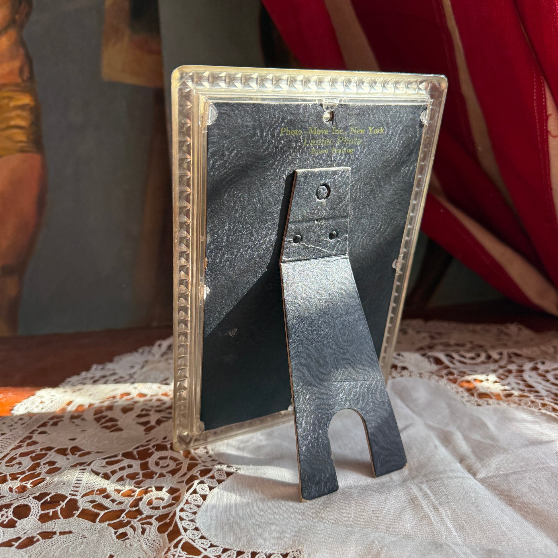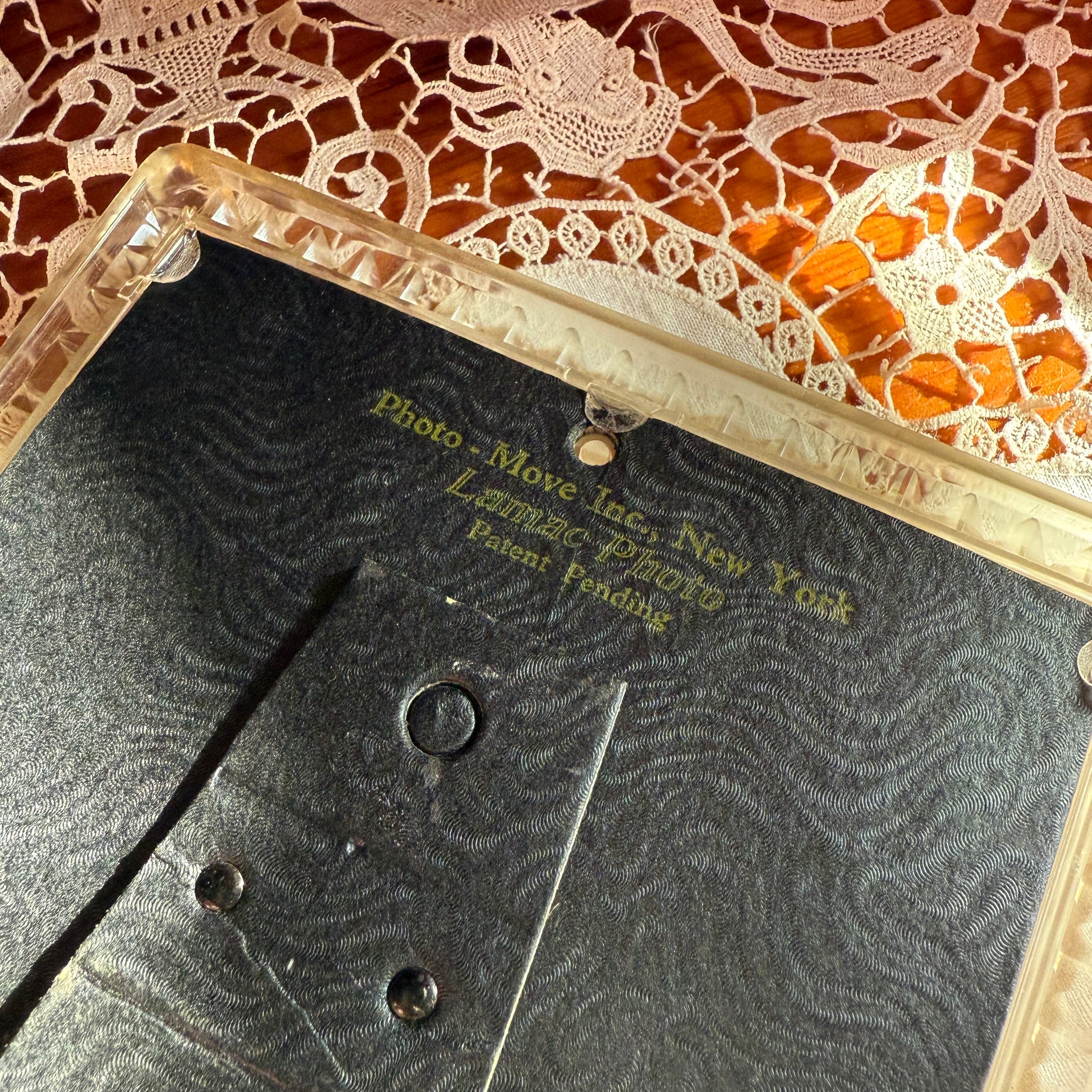 Clear celluloid plastic frame, her eyes wink and mouth smiles when photo is moved. Light wear throughout as shown. Marked on reverse.