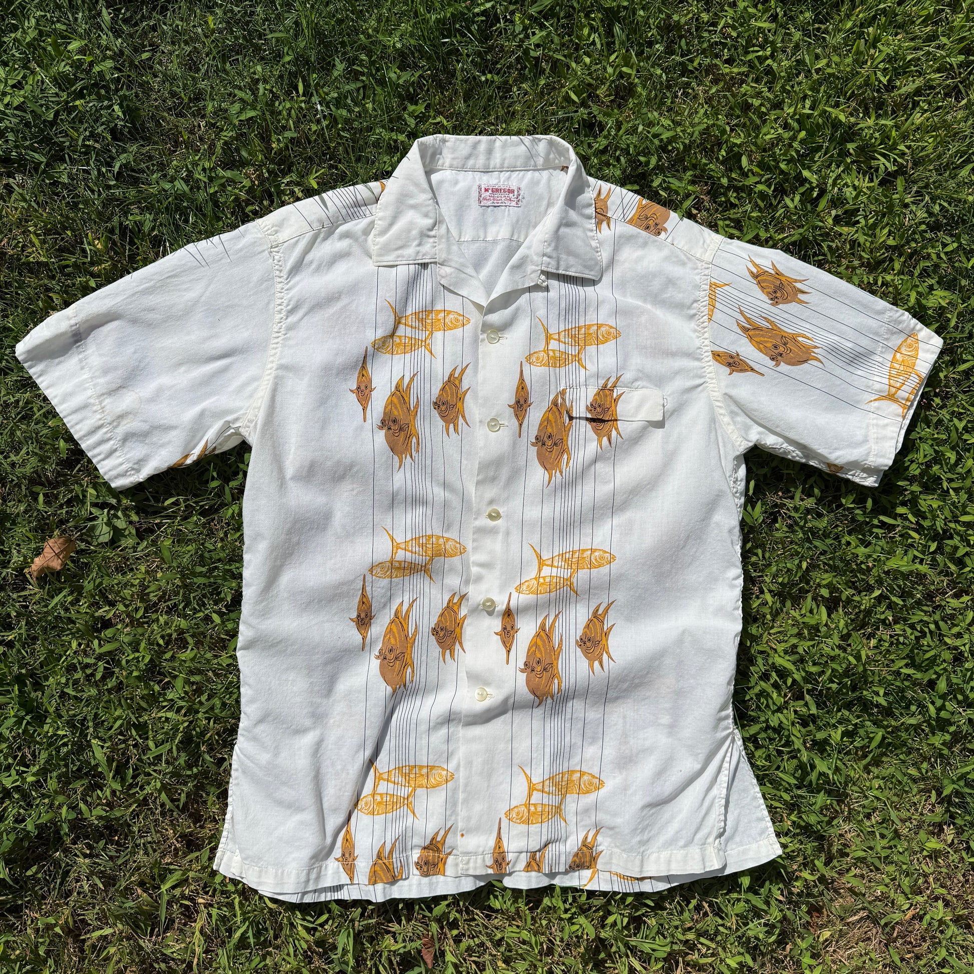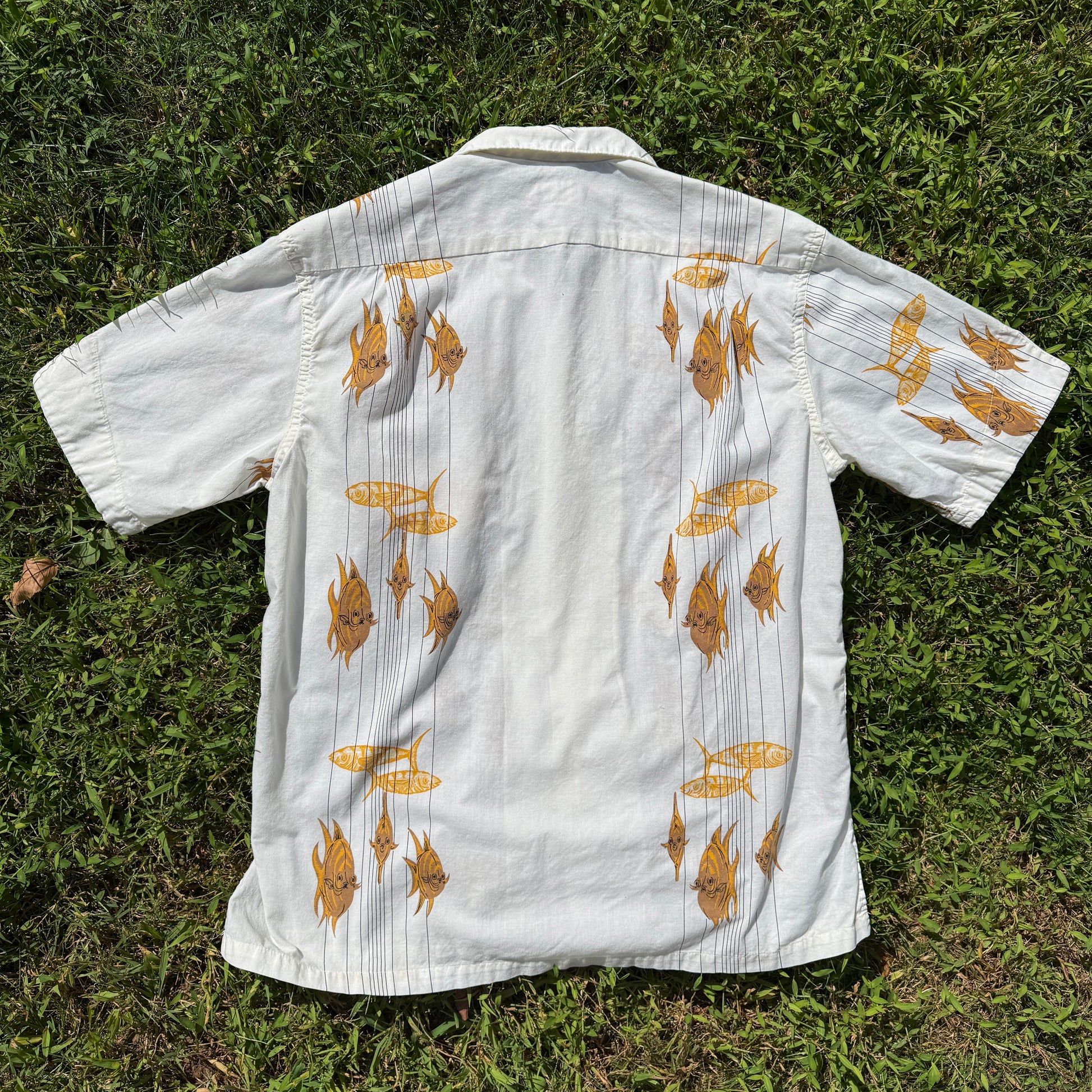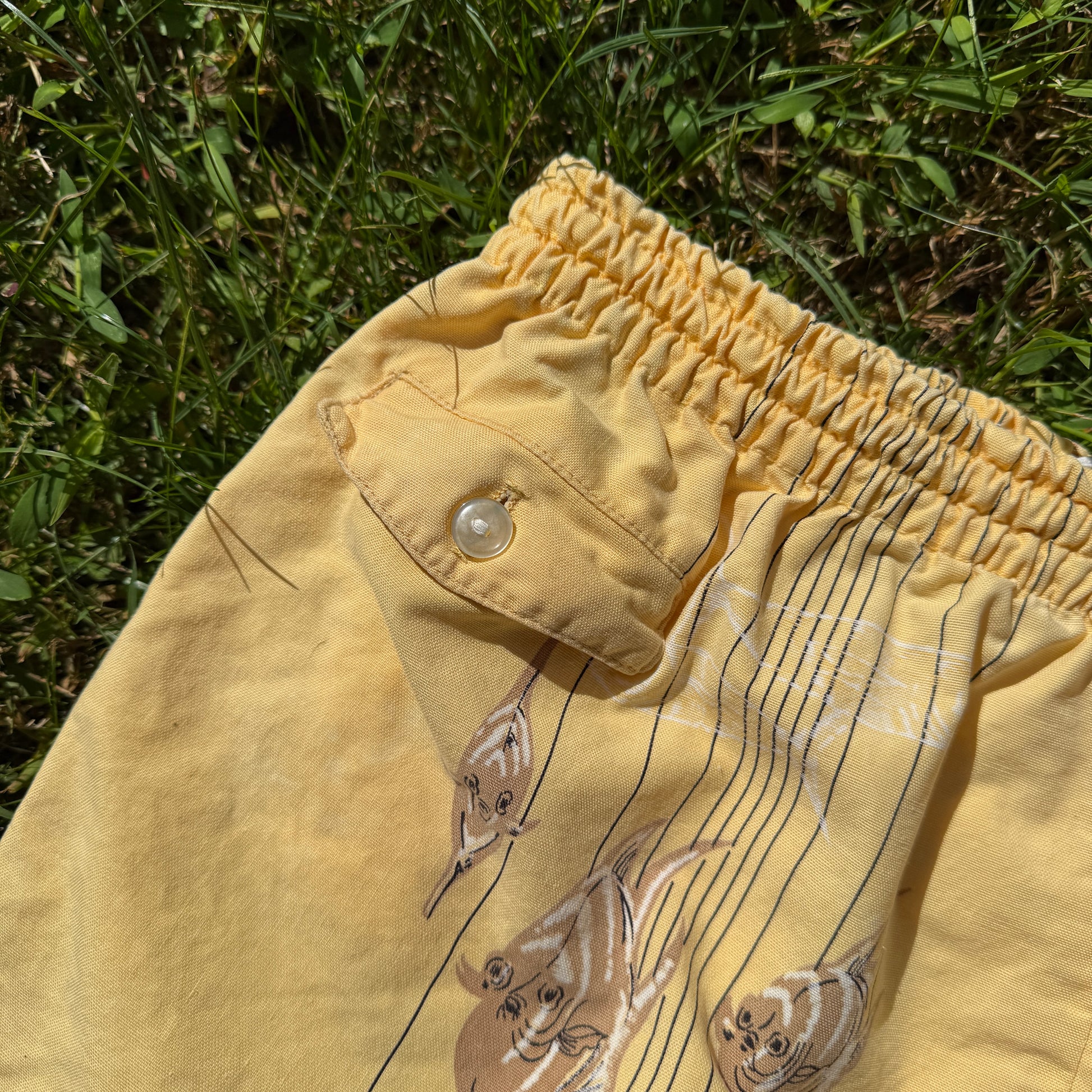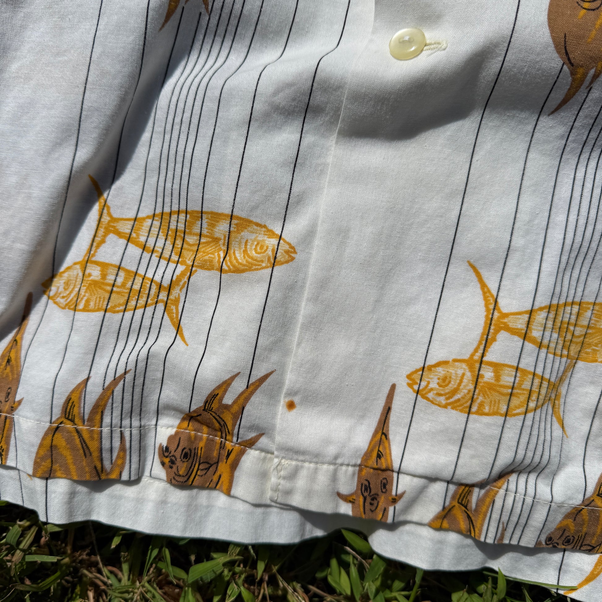 Cotton fish printed set. Button front polo shirt with breast pocket. Tie waist bottoms with small pocket and built in swimsuit. Light wear throughout as shown.