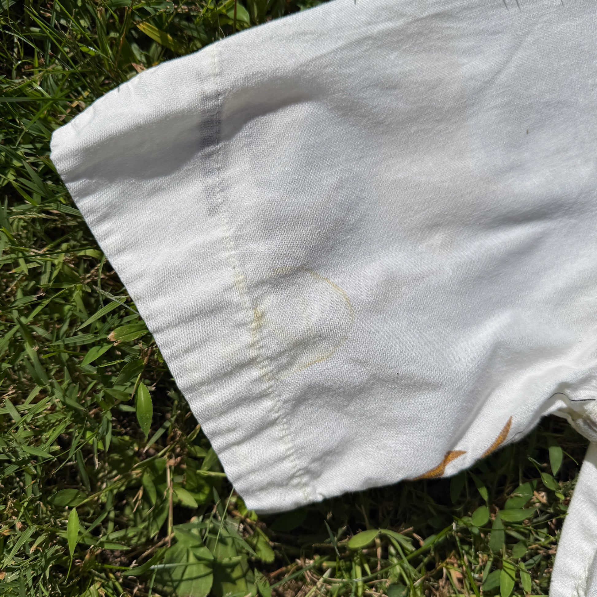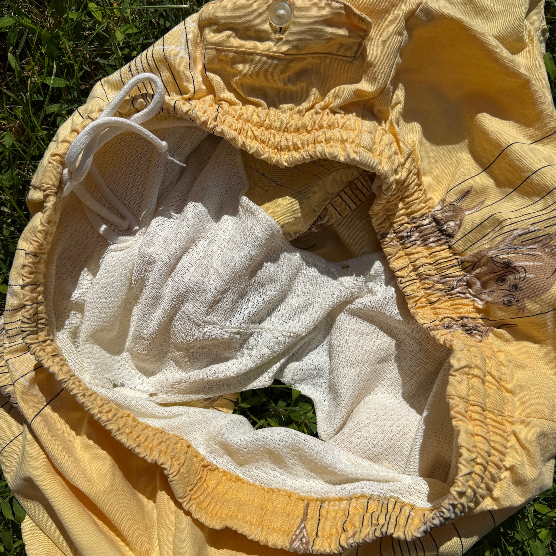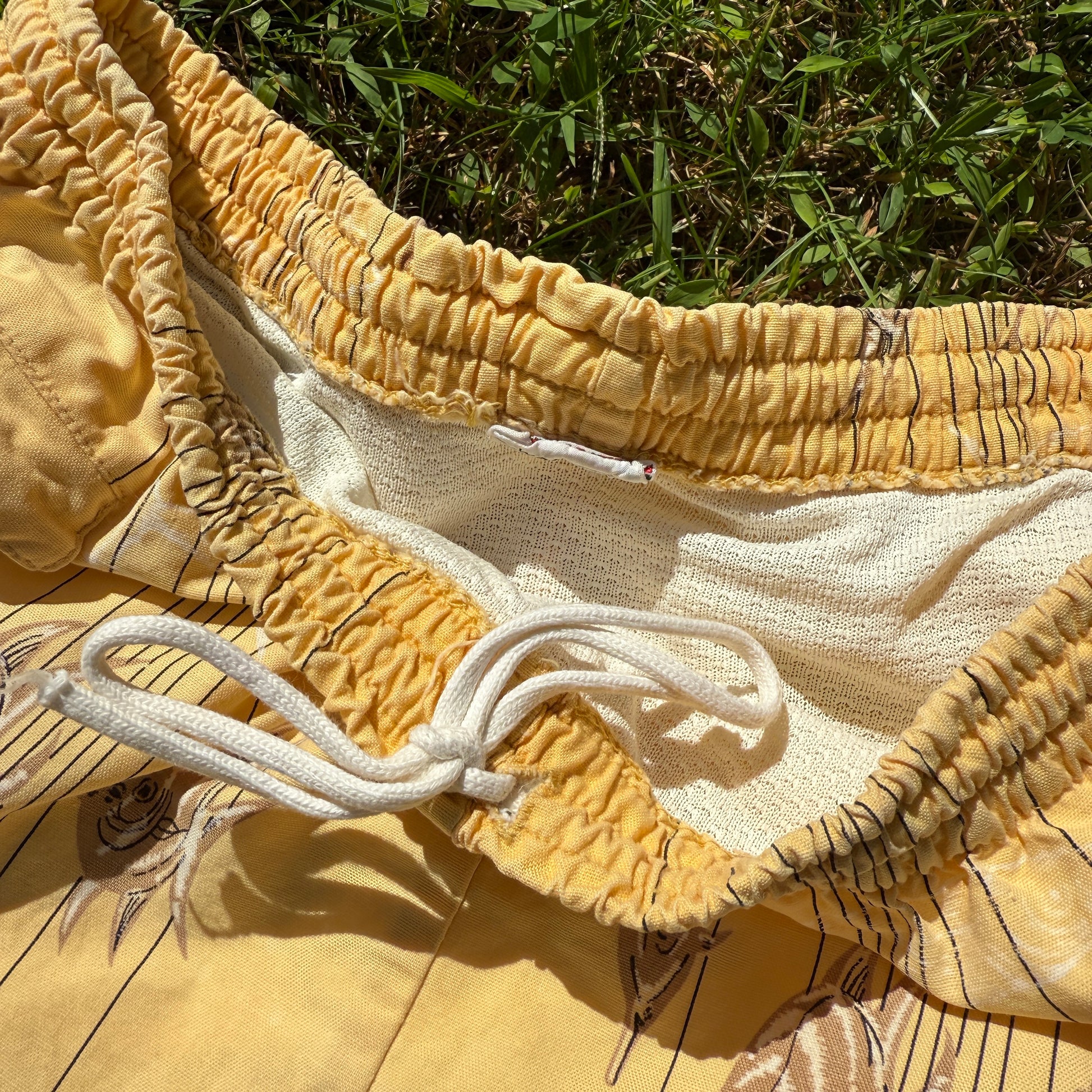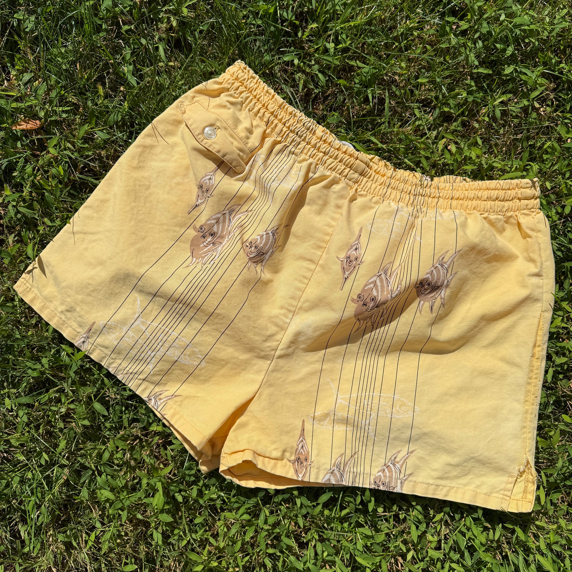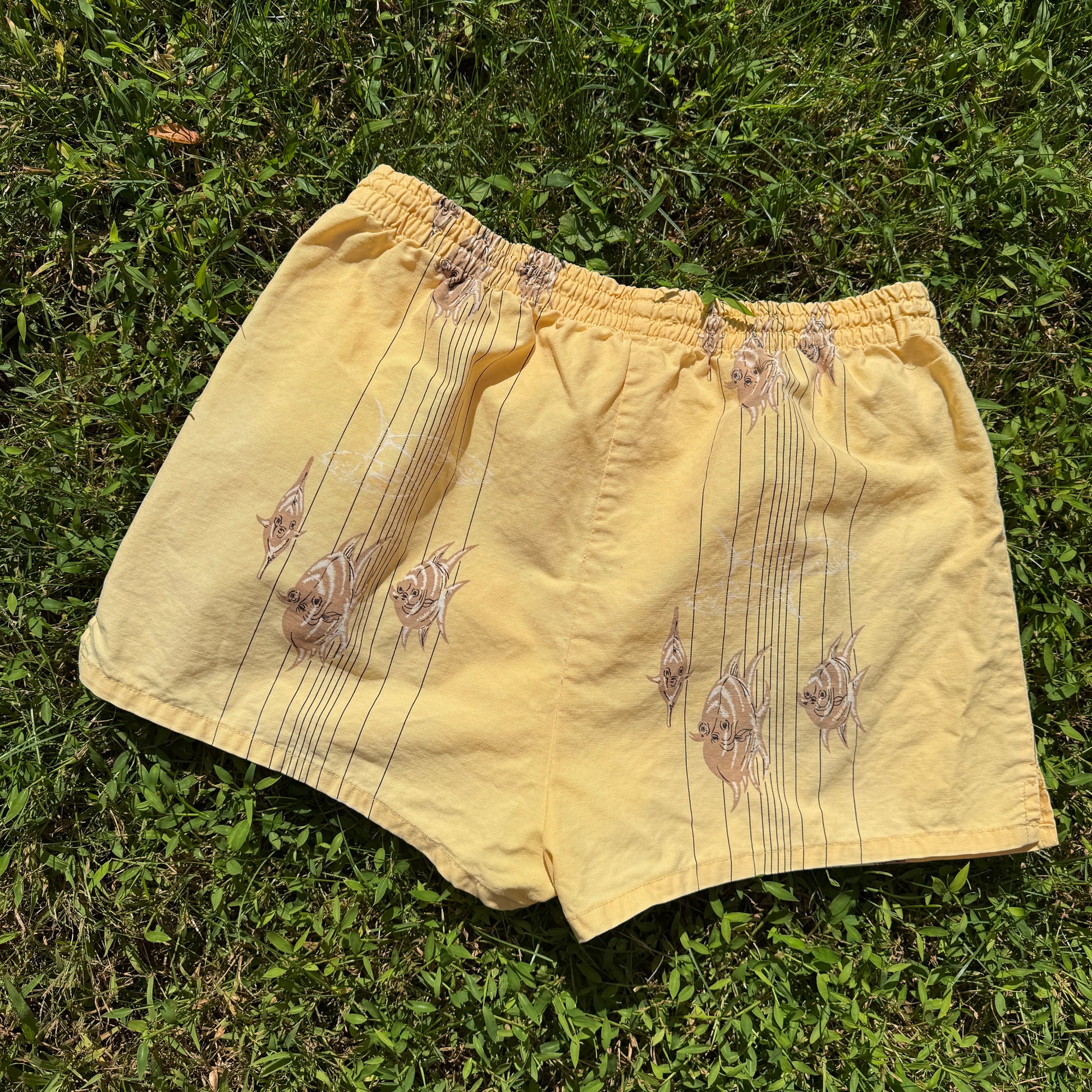 Cotton fish printed set. Button front polo shirt with breast pocket. Tie waist bottoms with small pocket and built in swimsuit. Light wear throughout as shown.
